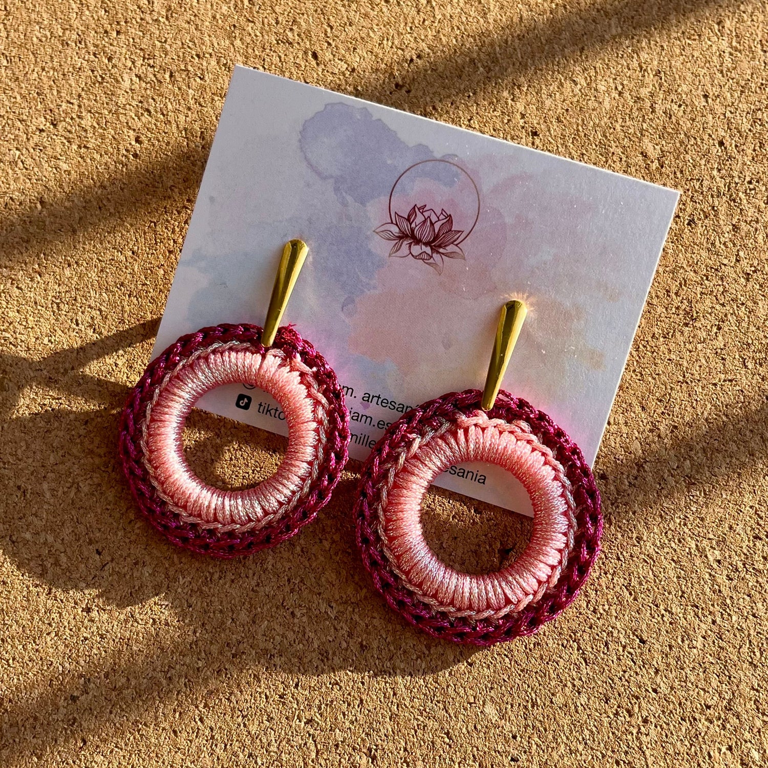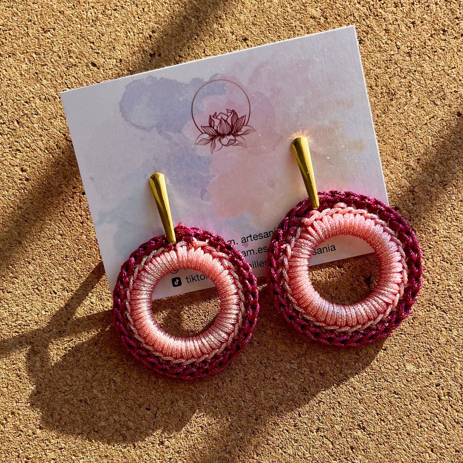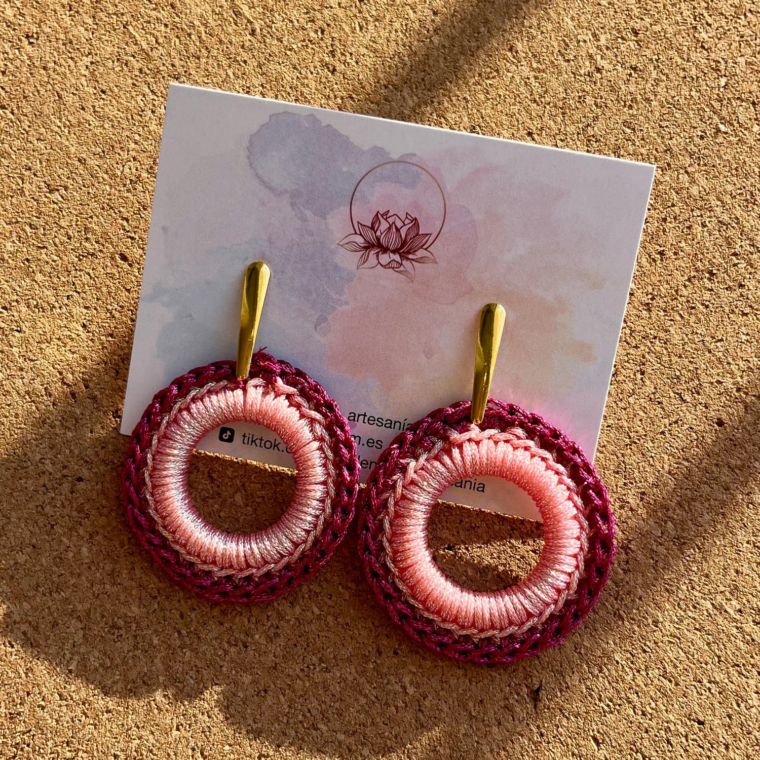 Los pendientes Ardena están tejidos a mano en crochet con un degradado espectacular que va del rosa empolvado al fucsia profundo, evocando la energía de un corazón vibrante.